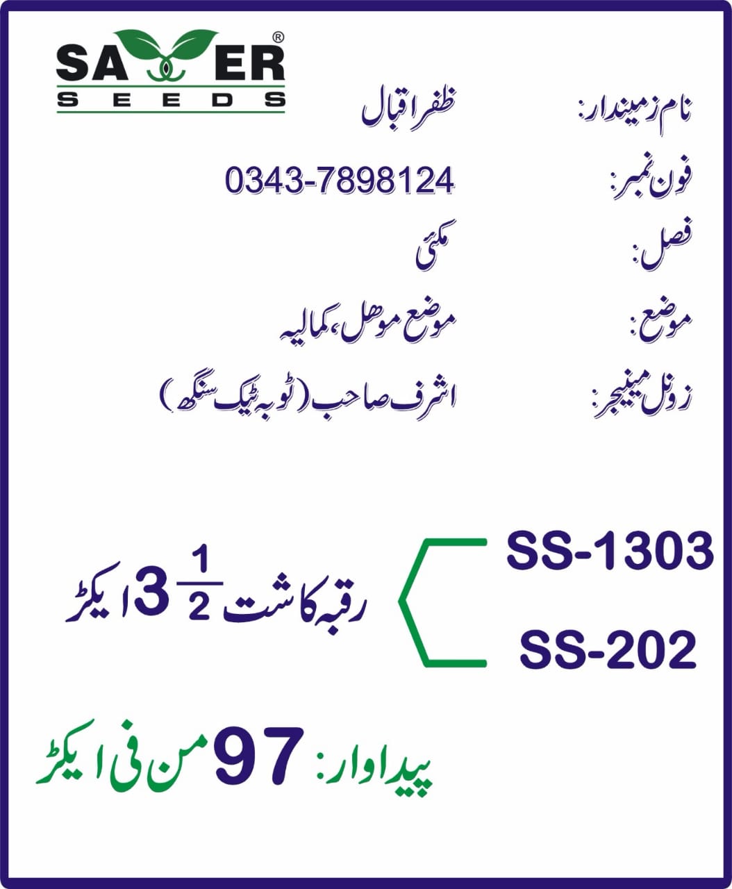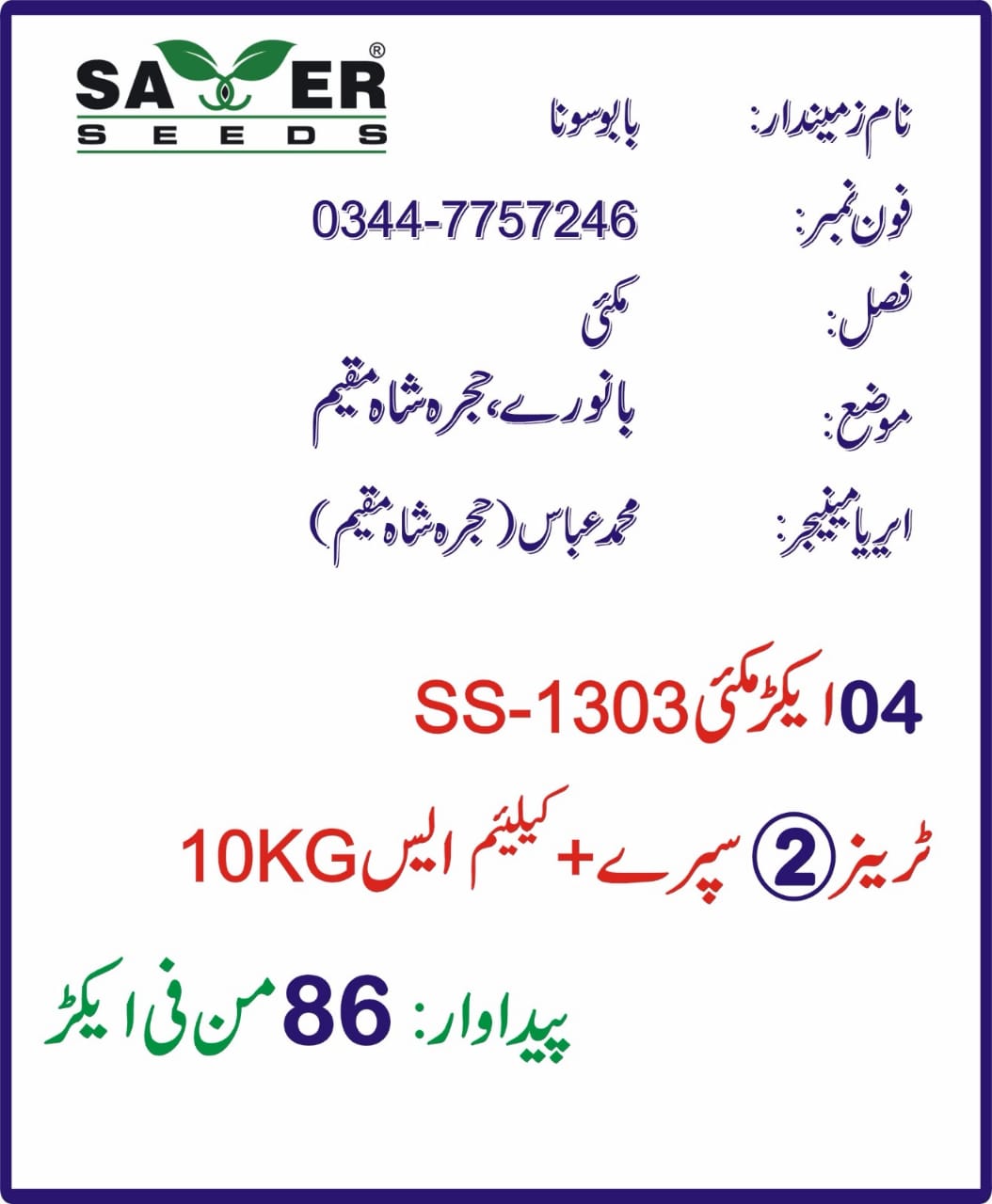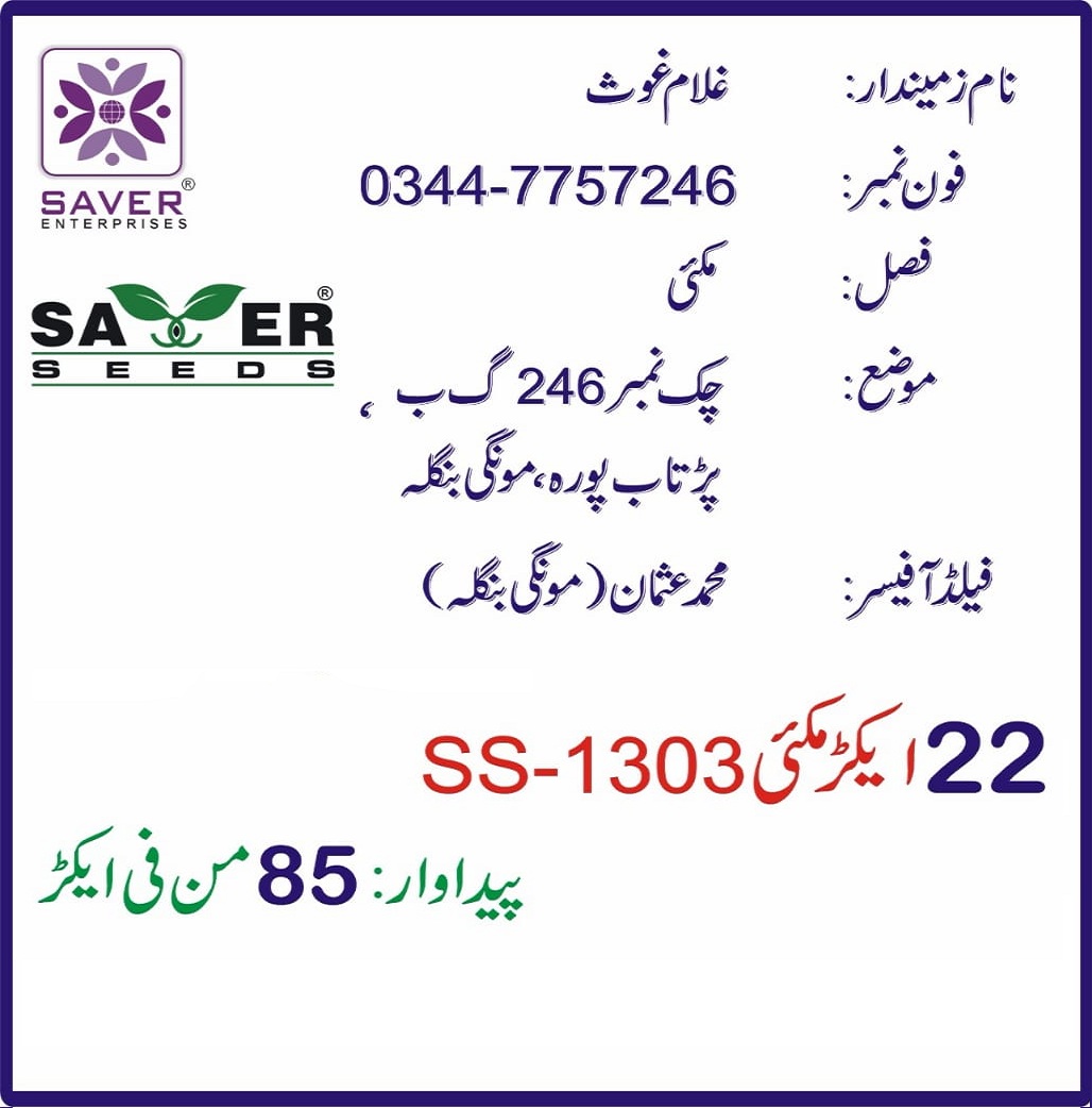 SS-1303 ko main ney 22 acre area par istemal kya or us sey mujhy 85 man per acre pedawar hue.Shukriya Saver Seeds.